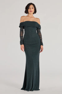 Grace your event in a shimmering glitter knit mermaid dress that features an elegant off-the-shoulder neckline with a foldover accent, sheer ruched long sleeves, and a sweeping long-length hem. Complete your formal event outfit with glitter block heels.