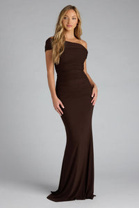 Margot One-Shoulder Cowl Neck Mermaid Dress Margot One-Shoulder Cowl Neck Mermaid DressSpecial Occasion Showcase your gorgeous curves in the stunning Margot formal dress designed with a smooth knit fabric with plenty of stretch. It features a one-shoulder neckline with a tank strap and a single spaghetti strap, a sultry sweetheart bust with a draped cowl neck overlay, a ruched bodice, and a floor-length mermaid silhouette to flaunt your figure. Fit & Features - Smooth knit fabric with plenty of stretch, stretchy knit lining