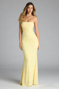 Maisie Sweetheart Ruched Mermaid Formal Dress Maisie Sweetheart Ruched Mermaid Formal DressSpecial Occasion Chic and oh-so-elegant, the Maisie mermaid formal dress was destined to leave everyone in awe at black-tie parties and celebrations! With delicate spaghetti straps and a cross-sweetheart neckline, this dress effortlessly hugs your curves with ruched side seams. The mermaid silhouette and floor-length hem create a stunning and distinctive look, while the smooth knit fabric ensures comfort and style all night long. Complete the look with a glam clutch and jewelry for a divine evening out! Fit & Features - Smooth knit stretchy fabric