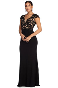 Special OccasionElevate your evening look in our sophisticated Tia black dress! She features a V neckline with unlined mesh inset, padded cups, cap sleeves, a contrasting nude hued mesh lining and floral appliques throughout. Her back is sheer and features a lower back keyhole. Her slim fit bodice leads to an elongating double lined floor length silhouette. Dress is composed a combination smooth knit and mesh fabric that offers a curve hugging fit with a moderate stretch. Includes a hidden lower back zipper closure with ruched detail.