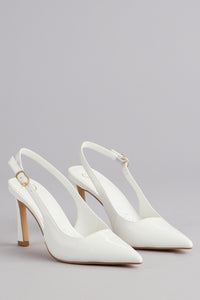 These patent slingback heels bring sleek shine with a pointed toe and stiletto finish. A timeless pair that works just as well with your office look as it does with your date-night dress.