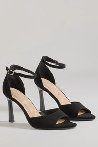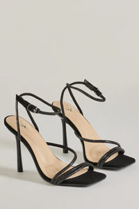Amp up the glamour of your night out looks in these sleek stiletto heels featuring an open square-shaped toe with a strap, an asymmetric strap across the foot, adjustable ankle and heel straps, and mini rhinestone embellishments for a luxe shimmer. Style with your fave clutch.