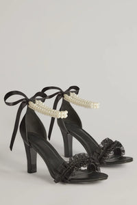 Elevate your dressy look and add a chic touch with these stiletto heels featuring an open almond-shaped toe with a sheer ruffled lace strap, a faux pearl beaded ankle strap, and a closed back with a sleek satin bow detail. Style with an envelope clutch.