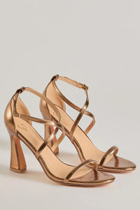 Show up and show out in these sleek metallic block heels with a glamorous glow. Designed with an open square toe and asymmetric straps, style with a rhinestone clutch.