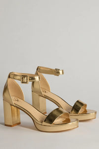 Got some glam plans? You won't be fully dressed without these metallic block heels! They feature a sleek almond toe, a thin strappy design, a block heel with a flared bottom, and a closed ankle with a buckle strap closure. Complete the look with the matching shoulder bag!