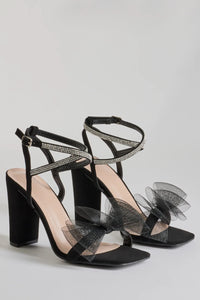 A pair of satin block heels feature a square toe, a statement tulle bow along the toe strap, and sparkly rhinestone adjustable ankle straps. Style with a hair accessory for any dressy occasion.