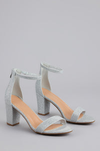 Sparkle Step Glitter Lurex Block Heels Sparkle Step Glitter Lurex Block HeelsBring the shimmer and shine when you step out in these eye-catching glitter lurex heels! They feature an open almond-shaped toe with a strap, a slim adjustable ankle strap, a back zipper closure, and a stabilizing block heel. Shoes are constructed with a metallic glitter material and have a faux leather cushioned insole. Complete the look with a skater dress and rhinestone anklet. Fit & Features - 3.25" Block heel