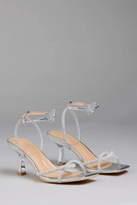 A showstopping stiletto heel adorned with a whimsical rhinestone butterfly accent on sleek metallic that turns heads!