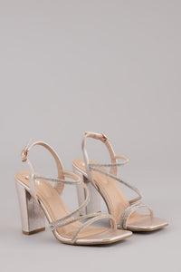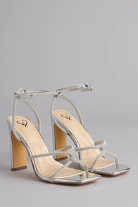 Bring on the glitz and glamour with these stunning stiletto heels! They feature an open square-shaped toe, asymmetrical straps with mini rhinestone embellishments, an adjustable ankle and heel strap with mini rhinestones, and a sleek stiletto heel. The faux leather material has a bold chrome sheen for major shine. Style these heels with a bodycon dress for your next night out.