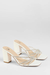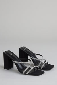 Add some shine and sparkle to your party look in these block heel mules with a dazzling rhinestone strappy design!
