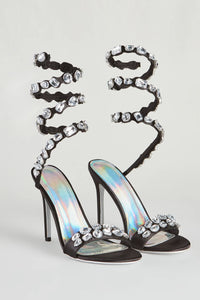 These heels didn’t come to play—they came to sparkle. Rhinestone-studded straps, flirty bow accents, and a spiral wrap that screams glamour.