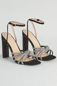 Create a look that evokes totally glam vibes with these chic block heels. They feature an open square toe, a knotted strappy design across the foot with sparkling rhinestone embellishments, a thin adjustable ankle and heel strap, and a slim block heel. Style with a sleek clutch.