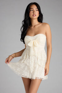 This adorable lace mini tube dress is flirty perfection with its strapless neckline, tie-back design, and short, bodycon silhouette with a tiered, ruffled hem. Style with strappy mules for a dressy party.