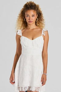 It's a love story, so say yes to this lace skater dress! Perfectly romantic for bridal showers, parties, or dates, this short dress has an alluring tie front bust and flirty ruffles along the skater silhouette.