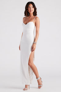 Simple yet oh-so-chic, the Cheryl high slit slim-fit formal dress is perfect for brides for engagement parties, bridal showers, or rehearsal dinners! She features a sleeveless sweetheart neckline with a draped cowl design, spaghetti straps, a floor-length hem with a stylish high side slit, and a flattering slim-fit silhouette. The crepe fabric offers a moderate stretch. Complete the look with rhinestone duster earrings and stiletto heels.