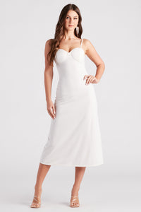 Effortless and romantic, this sleeveless midi dress is a staple to have for every occasion! It features a V-neckline with a twisted bust, spaghetti straps, a form-hugging silhouette, and a sultry front slit. The mid-length dress is stretchy and double-lined. Complete the look in rhinestone mules.