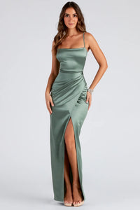 Make a stunning entrance at your next formal affair in the Lola high slit satin dress. This luxurious floor-length dress features a sleeveless cowl neckline, a floor-sweeping silhouette with a sultry high side slit to elongate your legs, and a form-hugging fit. Perfect for weddings, black-tie events, or school dances.