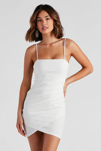 Get all wrapped up in this stylish sleek satin mini dress. Dance the night away at that upcoming wedding or celebrate a girl's night in this statement dress that will have all eyes on you. The dress features a sleeveless square neckline, spaghetti straps, and a ruched wrap silhouette that hugs curves in all the right places. The mini-length dress is composed of a satin-like fabric that offers a moderate stretch. Complete your look with rhinestone earrings and strappy heels.