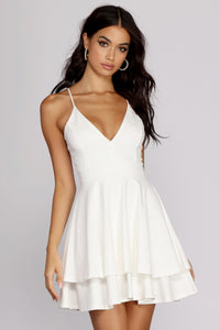 Live your wildest dreams in this dress! Bring the wow factor to your date-night outfit in this flirty skater dress. The dress features a flattering v-neckline, spaghetti straps that offer support, sheer lace back detail with a lower back keyhole to show off a hint of skin and a flowy skater silhouette with double-tiered hem. The dress is composed of a form-hugging ponte knit fabric that offers a moderate stretch. Complete your impressive look with rhinestone duster earrings and sleek stiletto heels.