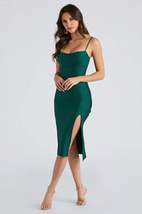 Reign the night in this satin midi dress featuring a sleeveless cowl neckline, spaghetti straps, and a form-hugging midi silhouette accented with an asymmetrical high slit.