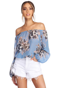 Showcase major flower power with this adorable floral print top! It features an elastic off the shoulder neckline, long sleeves with cuffed hems, and a relaxed fit with an elastic hem. The blue hued top is composed of a sheer woven fabric with no stretch.Model is 5'7" with a 30" bust, 22" waist and 33" hips. She is wearing a size small.