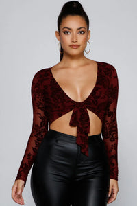 You'll definitely fancy this velvet burnout top for a night out! It features long sleeves, a plunging neckline with a tie-front on a cropped hem. Composed of a mesh-lined knit fabric with a moderate stretch. Style with chic faux leather pants.