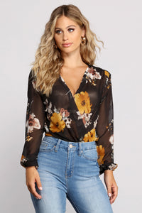 Show your floral passion in a bodysuit that brings the charm. The bodysuit features a surplice neckline, a gorgeous floral print, and a partially open back with a tie strap accent a the nape of the neck. The bodysuit is composed of an airy chiffon fabric that offers a relaxed fit with minimal stretch. Complete your outfit with high waist jeans and mules.