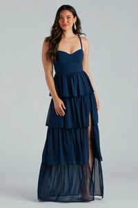 With a flirty slit and flattering silhouette, the Deborah formal chiffon dress is a lovely effortless option for outdoor weddings or banquets! She features a sleeveless sweetheart neckline adorned with ruched straps, a padded bust, and a breezy tiered ruffled A-line silhouette, front slit, and floor-length hem. The formal dress is composed of an airy chiffon fabric for a lightweight feel and has a smooth woven lining. Complete the look with sleek stiletto sandals and jewelry!