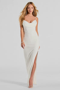 You'll be a vision in the Marsha long formal dress! Showcasing a flattering cowl neckline that highlights your bust and a figure-flattering mermaid silhouette with a flirty slit to show off your leg.