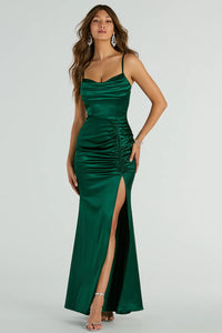 Jazmine Cowl Neck Slit A-Line Satin Formal Dress