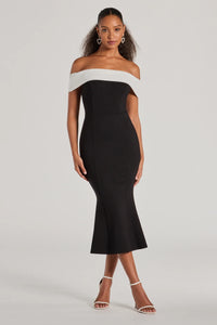 A sultry off-the-shoulder midi dress features a contrast folded neckline and flattering mermaid silhouette with a flared midi-length hem. The ponte knit fabric offers the perfect amount of stretch.