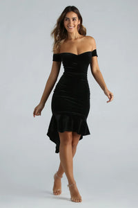 Elevate your evening look in this stunning velvet midi dress! Boasting an alluring off-the-shoulder neckline, the knee-length dress features short-sleeve cuffs, a non-slip grip lining, a form-hugging fit, and a ruffled midi-length hem, this velvet dress exudes elegance. Complete the look in high heels for a semi-formal party!