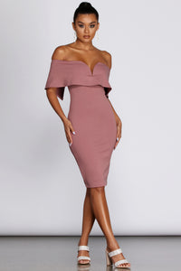 Your party look is on point with this midi dress! It has a off the shoulder neckline with a ruffle popover, a V wire front, an exposed back zipper, and a body-hugging fit. Dress is composed of a flattering ponte knit fabric with a moderate stretch.