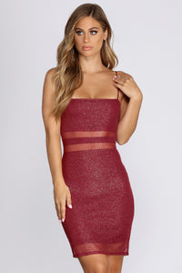 Glimmer and glitter the night away in this mini dress that will be sure to make you stand out! It features a sleeveless bodice, spaghetti straps, a square neckline, a sheer waist inset with a mini waistband detail, and a short, form-hugging fit. The dress is composed of a sheer glitter mesh fabric with a knit lining and offers moderate stretch. Glitter may transfer.
