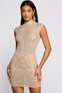 Make a stunning entrance in our gorgeous Vicky mini dress! She features a trendy mock neckline with short cap sleeves, a mini length form-hugging silhouette, and allover glimmering heat stone embellishement. The mesh fabric offers plenty of stretch and includes a back zipper closure for comfortable wear. Pair this dress with a pack of sparkly rings to add that extra glam factor.