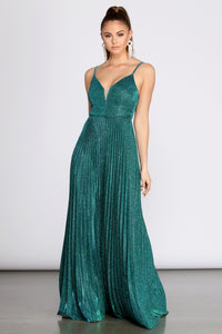 Let your presence be known as soon as you step foot in our gorgeous Aida! Crafted from woven glitter fabric, everyone will be stunned as she changes hues in the light. Her pleated floor-length skirt adds dimension and ease as you glide and dance through the night! Be sure to pick up an envelope clutch to store all your essentials!