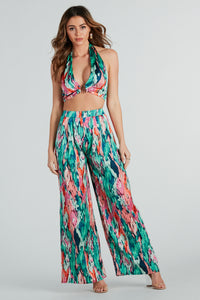 Color you pretty in these satin pants to brighten up this new season! They feature a flattering high-rise waist, an elasticized back band, front pleating, and a wide-leg silhouette on smooth satin with an abstract print. Complete the look with the matching top for a vacation!