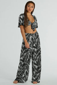These tropical palazzo pants are ready for your next vacay! Features a high-rise waist and wide-leg silhouette for a flattering fit. The palm print on knit fabric adds a touch of paradise to any outfit. Complete the look with the matching top.