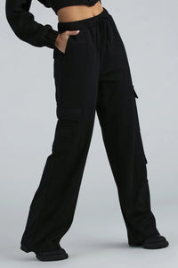 Pull off a cute operation in these cargo sweatpants! They feature a high-rise elasticized drawstring waist with tie, hidden side pockets, back flap pockets, and three lower flap pockets along the wide-leg silhouette on smooth scuba knit fabric. Complete the look with the matching hoodie for lounging or running errands!