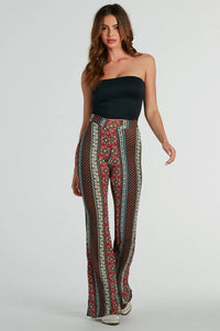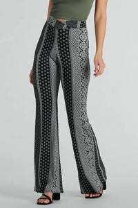 Channel those effortless and breezy vibes in these boho print knit flare pants perf for festival season. The soft and stretchy brushed knit fabric features a trendy bohemian-inspired multi-print pattern for an eye-catching look. The high waist has a V-front design to create that snatched silhouette, with a back elastic band for comfortable wear. The hip-hugging fit continues through the leg, leading to a flared hem. Complete your outfit with a crochet top and strappy sandals!