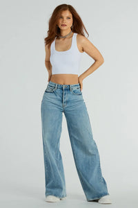 This pair of high-rise wide-leg jeans is an iconic staple that needs to be in your wardrobe! Made with a structured cotton-blend denim fabric, these jeans feature a high waist and a trendy wide-leg silhouette with a clean design and subtle front distressing for a chic relaxed look. The waist is detailed with belt loops, a hidden button-down closure, and front and back pockets. Style these jeans with your fave crop top and sneakers.