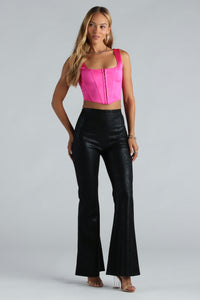 Make a major flex in these faux leather pants to showcase an elevated style! They feature a flattering V-cut mid-rise waist designed to give an hourglass effect, a hip-hugging fit, and a flared hem. Complete the look in a corset top for cocktail hour!