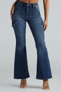 Take your look to the next level in these must-have denim jeans perfect for the new season! The jeans feature a flattering high-rise waist, hip-hugging fit, cargo-style flap side pockets, and a flared hem. The jeans are composed of a dark wash denim fabric with slight color fading for a vintage-inspired look. Style the look with a sassy corset top for happy hour or a casual dinner!