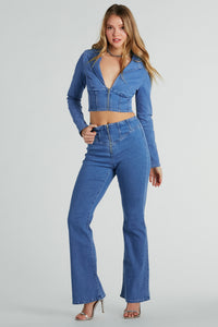 Shape up in these figure-flattering denim jeans for a chic snatched appearance! They feature a high-rise corset trim waist, an exposed front zipper, hidden hook-eye closure, figure-enhancing seam details, a hip-hugging fit, and a flared hem. Complete the look with the matching blazer.