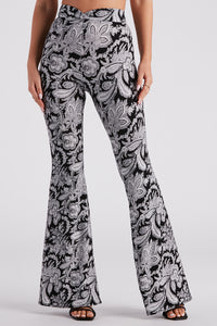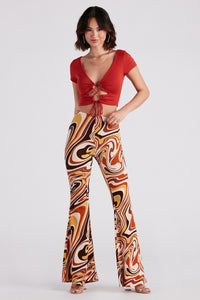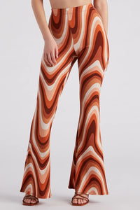 Everyone will be in a dreamy daze when they see you in these trendy flare pants! They feature a high-rise waist, a hip-hugging fit, a form-hugging fit throughout the legs, and a flared hem. The stretchy brushed knit fabric features a retro-inspired swirl print pattern that will draw all the attention! Style with a corset top and clear mules for a music festival.