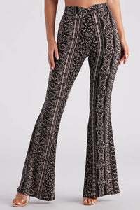 Own your boho status! These paisley print pants feature an on-trend cross-high waistband, a hip-hugging fit, and a flared hem. Complete the look in a sleek corset top for a festival!