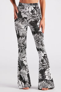 You'll look resort-ready in these trendy tropical print flare pants! They feature a high-rise waist, a hip-hugging fit, a form-hugging fit throughout the legs, and a flared hem. The stretchy knit fabric features a bold tropical palm leaf print that is perfect for pairing with a basic crop top. Complete your vacay look with strappy sandals.