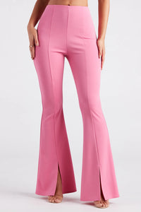 Make the decision to add these chic crepe pants to your fashion closet! They feature an elasticized high-rise waist, and seam detailing along the front that leads to the slit flare hem. Style with a blazer and lace corset to complete your babe-status look!