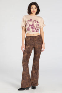 Serve up a sassy vibe in these faux suede flare pants with a trendy leopard print. The high waist features a hip-hugging fit, leading to a stylish flared hem.