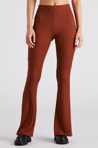 Style up these comfy ribbed knit flare pants and you'll be a total trendy babe! They feature a high-rise elasticized waist, a hip-hugging fit that continues down the leg, and a flared-out hem. The ribbed knit fabric offers plenty of stretch for comfortable wear. Pair with a crop top and a button-down shacket for the cutest look!